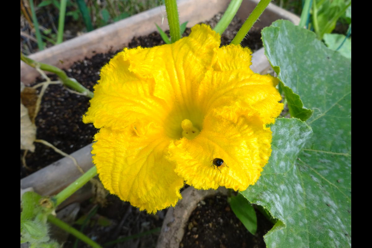 顕微鏡で観察したものはカボチャの花粉であることを告げる。その後、花の違いについて写真を見せる。1学期の最初の時間に、めしべやおしべなど、花のつくりを先に学習したので「おしべ」「めしべ」などの声が出る。写真を見ながら、解説していき、メダカの精子がたまごにつくと子メダカができることと、ガボチャの実ができることに共通点がありそうだと感じさせることができた。